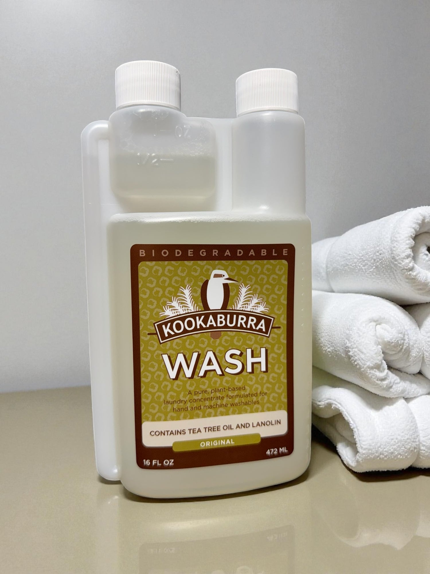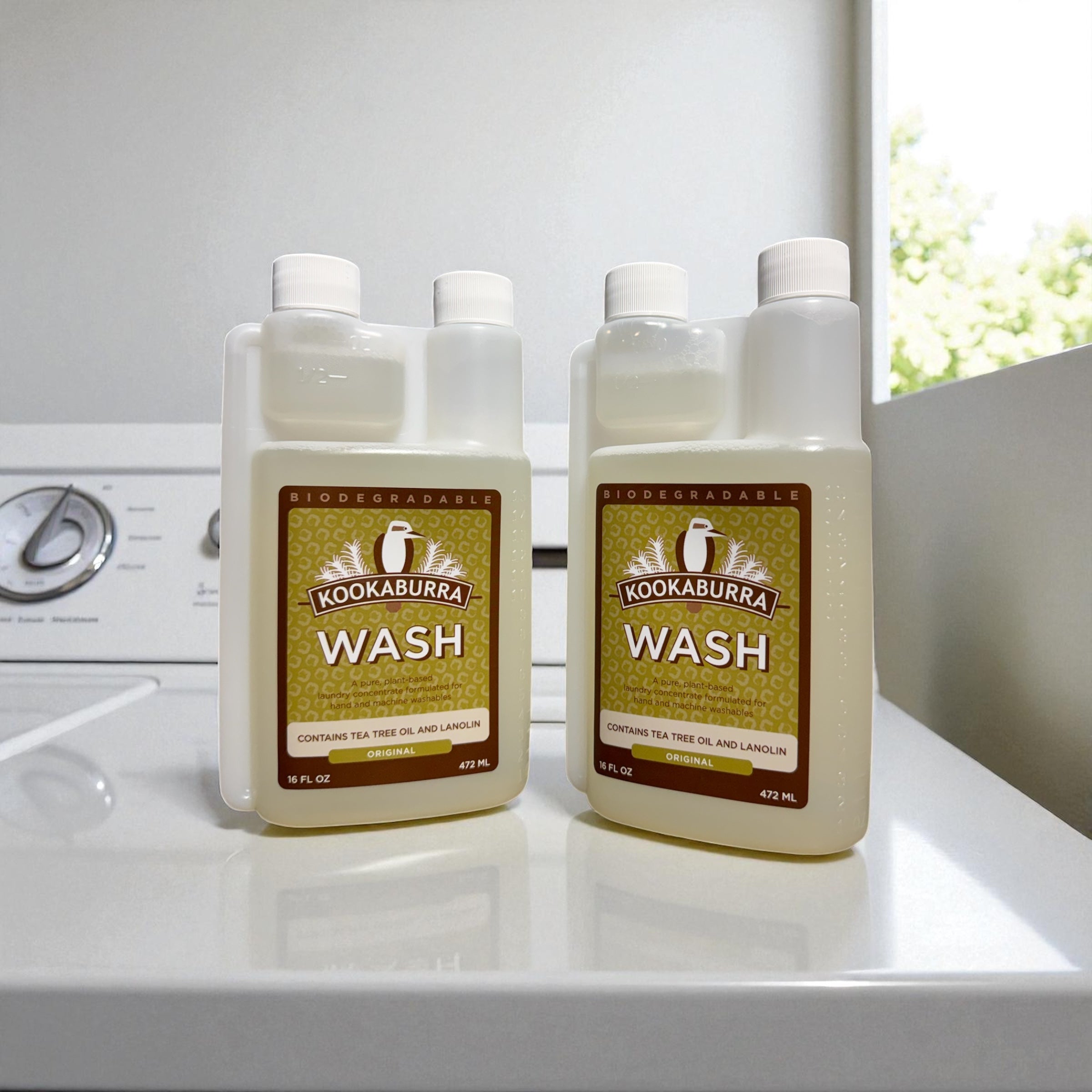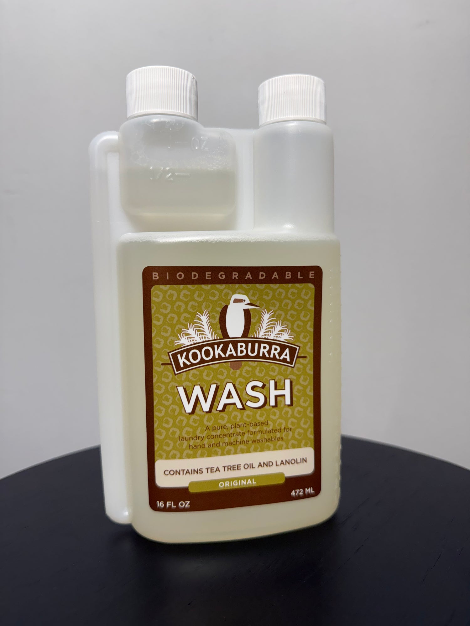 Kookaburra Wash (16 oz) is a natural, plant-based cleaning solution trusted for delicate fabrics, wool, activewear, and everyday laundry. With the power of tea tree oil, it cleans deeply, removes odors, and preserves fabric softness—all without harsh chemicals.